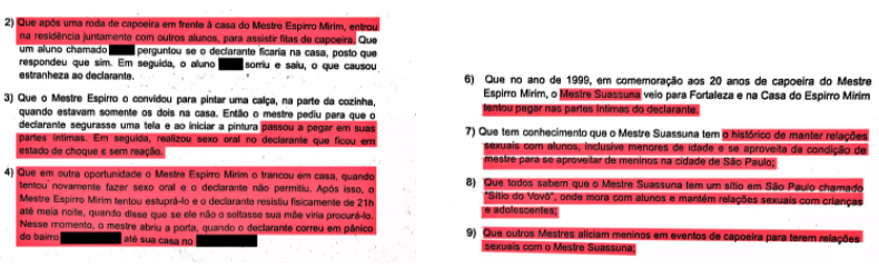 A Pública ouviu ainda outras denúncias contra os mestres Espirro Mirim e Suassuna, todas parecidas: alunos, geralmente menores de idade em situação de vulnerabilidade social e que pretendiam seguir carreira na capoeira, eram assediados, sofriam abusos ou eram levados a acreditar que só viajariam e se tornariam professores se aceitassem entrar para o esquema de exploração sexual.