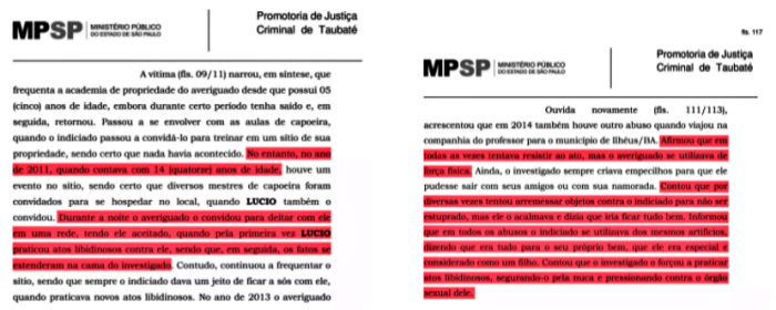 “Ele falava que se fizesse sexo com ele a gente ia ter graduação [na capoeira], ia ser famoso, ia viajar para o mundo inteiro. E sei lá, a gente, criança, se deixa levar, sonhava em viajar, sonhava em chegar em algum lugar pra poder ajudar a nossa família. A gente não tinha maturidade, e ele assediou. Ele ficava passando a mão nas partes íntimas”, lembrou em entrevista à reportagem.