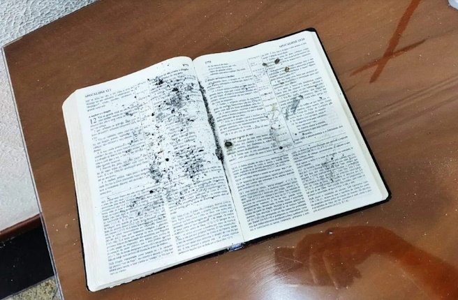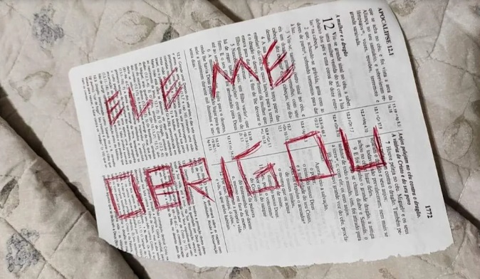 Dentro do imóvel, em uma página do livro Apocalipse, estava escrita a mensagem “ele me obrigou”. Em uma parede e nas portas de dois cômodos foram grafados os números 666.