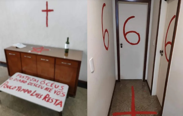 Uma outra imagem mostra o desenho de um crucifixo, um pentagrama e os versículos do Apocalipse que dizem: “Festejai ó céus, o diabo desceu até vós, pouco tempo lhes resta”.