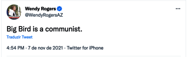 Senadora pelo estado do Arizona, Wendy Rogers escreveu em sua rede social que Garibaldo era comunista por apoiar a vacinação. “Garibaldo é um comunista“, escreveu a republicana.