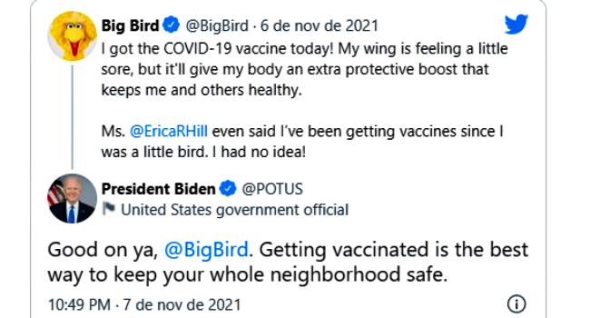 O presidente dos EUA, Joe Biden, aproveitou para interagir e propagar a vacinação como melhor forma de se prevenir em meio à pandemia. “Ser vacinado é a melhor maneira de manter a segurança de toda a sua vizinhança”, publicou o democrata, que seguidamente incentiva a população norte-americana a se vacinar. No país, há uma alta taxa de rejeição aos imunizantes.