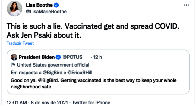 A jornalista da Fox News Lisa Boothe respondeu diretamente a Biden dizendo que a proteção da vacina é “uma mentira”. Segundo ela, “vacinados contraem e disseminam o covid”.