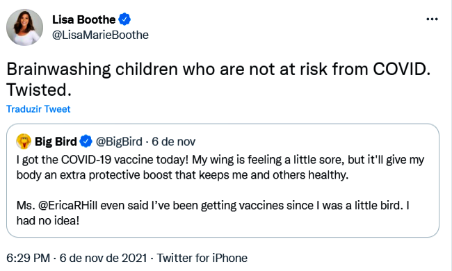 A comentarista política conservadora, também respondeu ao personagem de ficção que a campanha é uma “Lavagem cerebral em crianças que não correm risco de COVID”.