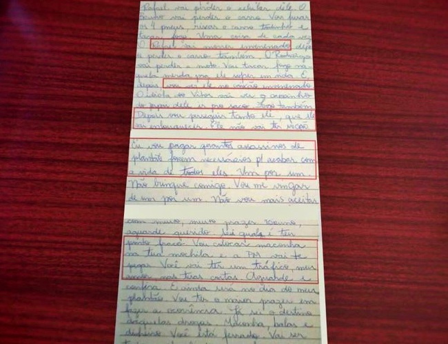 A Polícia Civil apreendeu um caderno na casa de Rafaela, onde estão supostas ameaças a ex-namorados. O diário, escrito à mão, foi encontrado em julho passado.