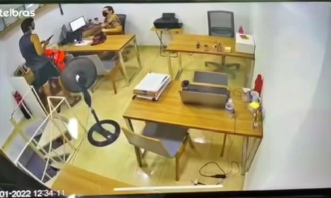 A situação foi gravada por uma câmera de segurança do circuito interno, no qual é possível ver o momento em que o homem tira a arma de uma bolsa vermelha e aponta para a mulher que se levanta da cadeira e inicia a luta corporal.