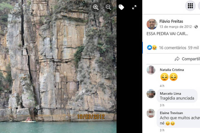 No dia 10 de março de 2012, o médico Flávio Freitas viajou com a família para Capitólio, em Minas Gerais, e registrou todo o passeio em fotos. Entretanto, uma das imagens chamou a atenção. Uma fissura numa das paredes do cânion ganhou a legenda “essa pedra vai cair” no álbum de fotos no Facebook. Passados 10 anos, o bloco de pedra fotografado pelo médico desabou em cima de três embarcações, provocando até agora a morte de 8 pessoas e deixando outras duas desaparecidas na cidade turística de Minas Gerais.