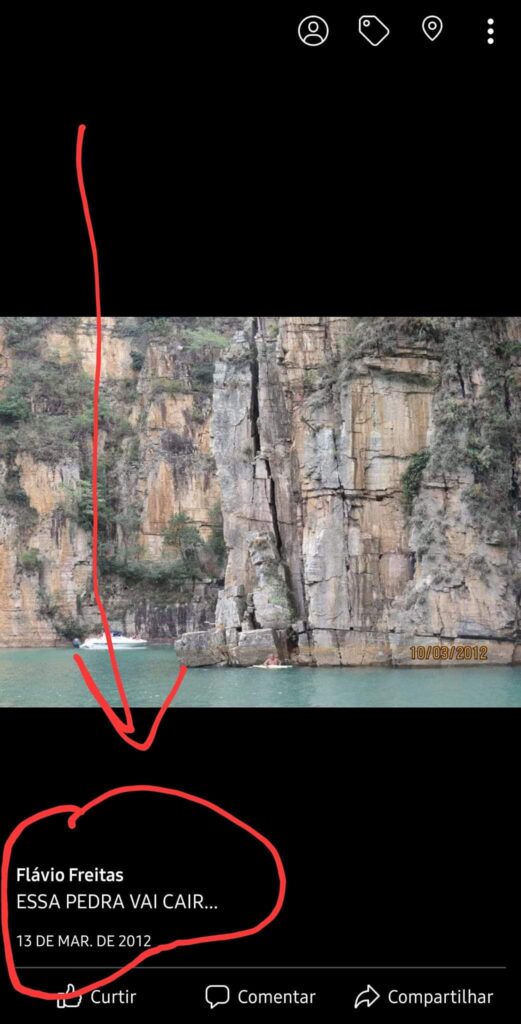 A publicação da imagem com a “premonição” de Flávio em 2012 correu as redes sociais logo após a tragédia de Capitólio e vários internautas comentaram a respeito, chamando a atenção para a falta de segurança no local. O médico fotografou o mesmo bloco de rochas que caiu, mas de um ângulo diferente.