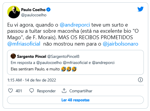 “Eu vi agora quando o André Porciuncula teve um surto e passou a tuitar sobre maconha (está na excelente bio ‘O Mago’, de F. Morais). Mas os recibos prometidos Mario Frias não mostrou nem para o Jair Bolsonaro“, escreveu Paulo Coelho, ao rebater as críticas do responsável pela Rouanet.