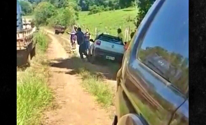 Nas imagens, é possível ver o momento em que o comerciante Cláudio Silvestre Ayala chega de carro até o local e começa a brigar com um homem que está parado na estrada. O homem é funcionário do agricultor que disputa terras.