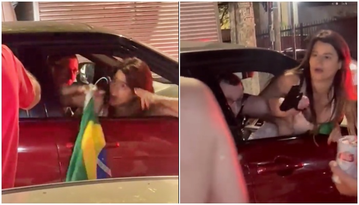 É possível ver nas imagens que o casal está dentro de um carro vermelho. Com o vidro da janela abaixado, a mulher coloca metade do corpo para fora e começa a xingar os eleitores de Lula, que estavam comemorando a vitória do petista.