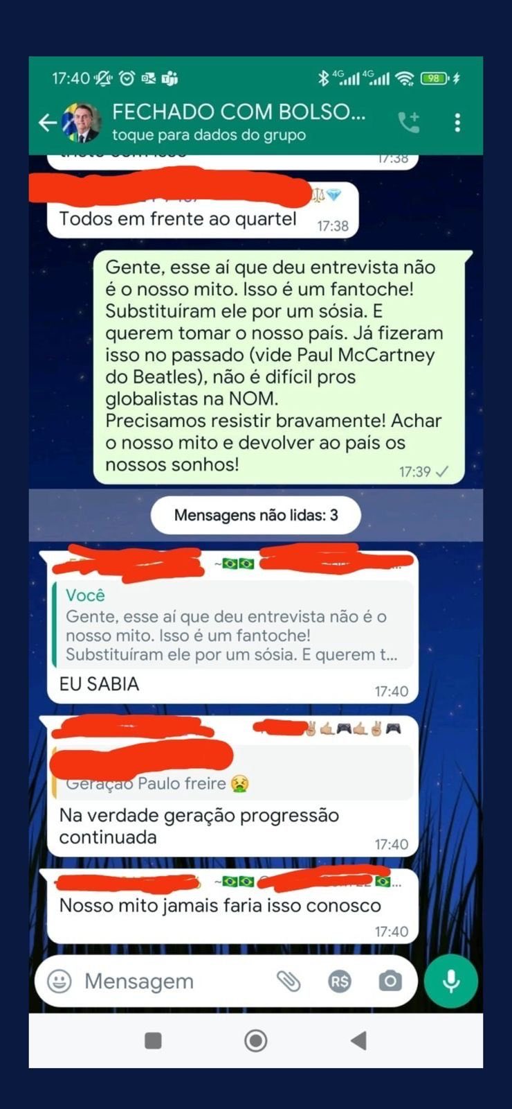 “Esse que deu a declaração não é Bolsonaro. Substituíram por um sósia. Já fizeram isso no passado com Paul McCartney dos Beatles. Não é difícil pros globalistas da NOM; precisamos encontrar nosso presidente”, bradou uma apoiadora do presidente.