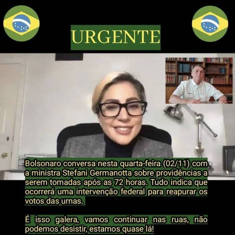 “Bolsonaro conversa nesta quarta-feira (02/11) com a ministra Stefani Germanotta sobre providências a serem tomadas após as 72 horas. Tudo indica que ocorrerá uma intervenção federal para reapurar os votos das urnas. É isso galera, vamos continuar nas ruas, não podemos desistir, estamos quase lá!”, dizia mensagem que viralizou.