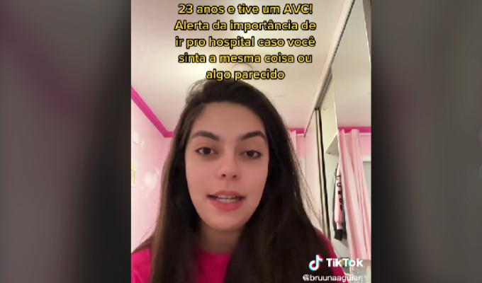 Bruna Aguiar Machado, de 23 anos, relatou ter sofrido um AVC (acidente vascular cerebral). Em uma sequência de vídeos publicados em seu perfil de uma rede social, a jovem contou sobre o ocorrido e fez um alerta para que as pessoas procurem um hospital assim que começarem os sintomas.