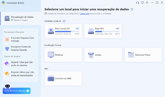 O 4DDiG Data Recovery é compatível com Windows e macOS, e suporta a recuperação de laptops/PCs, discos internos e externos, pen drives, cartões SD, sistemas de armazenamento em rede (NAS), etc.