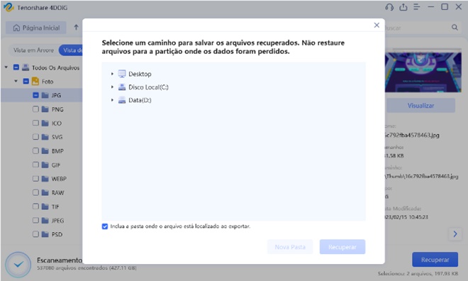 Após selecionar o local de salvamento, clique em “OK” e o software iniciará o processo de recuperação dos arquivos selecionados para o local especificado.