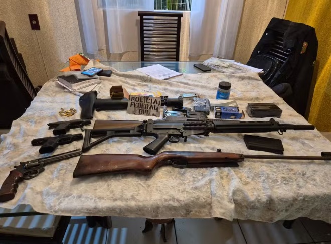 Durante a operação, foram apreendidas armas de guerra em Minas Gerais: cinco fuzis de precisão (com silenciadores), 15 pistolas, lança-rojão tipo AT 34, minas magnéticas, explosivos, carros com placas frias e até uma frota de veículos Doblò destinados à execução dos crimes.