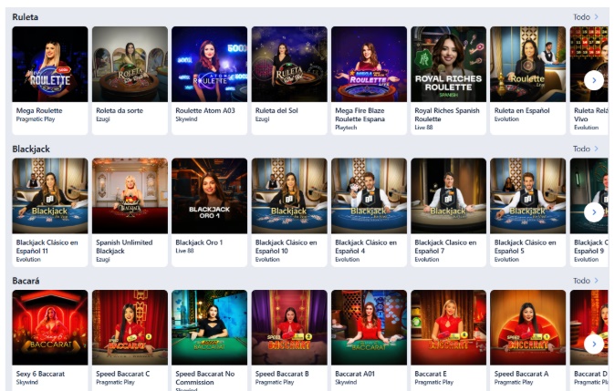 Ruleta, blackjack, baccarat y póker están disponibles, junto con juegos en vivo de estilo más interactivo. Hay múltiples variantes dentro de cada categoría, lo que permite ajustar la experiencia al nivel y ritmo de cada usuario.