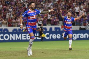 Yago Pikachu e Lucero comemoram o primeiro gol do Fortaleza sobre o Boca Juniors-Reprodução/Twitter Sudamericana BR