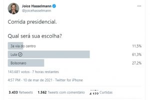 Joice promove enquete sobre eleição presidencial e se surpreende com resultado